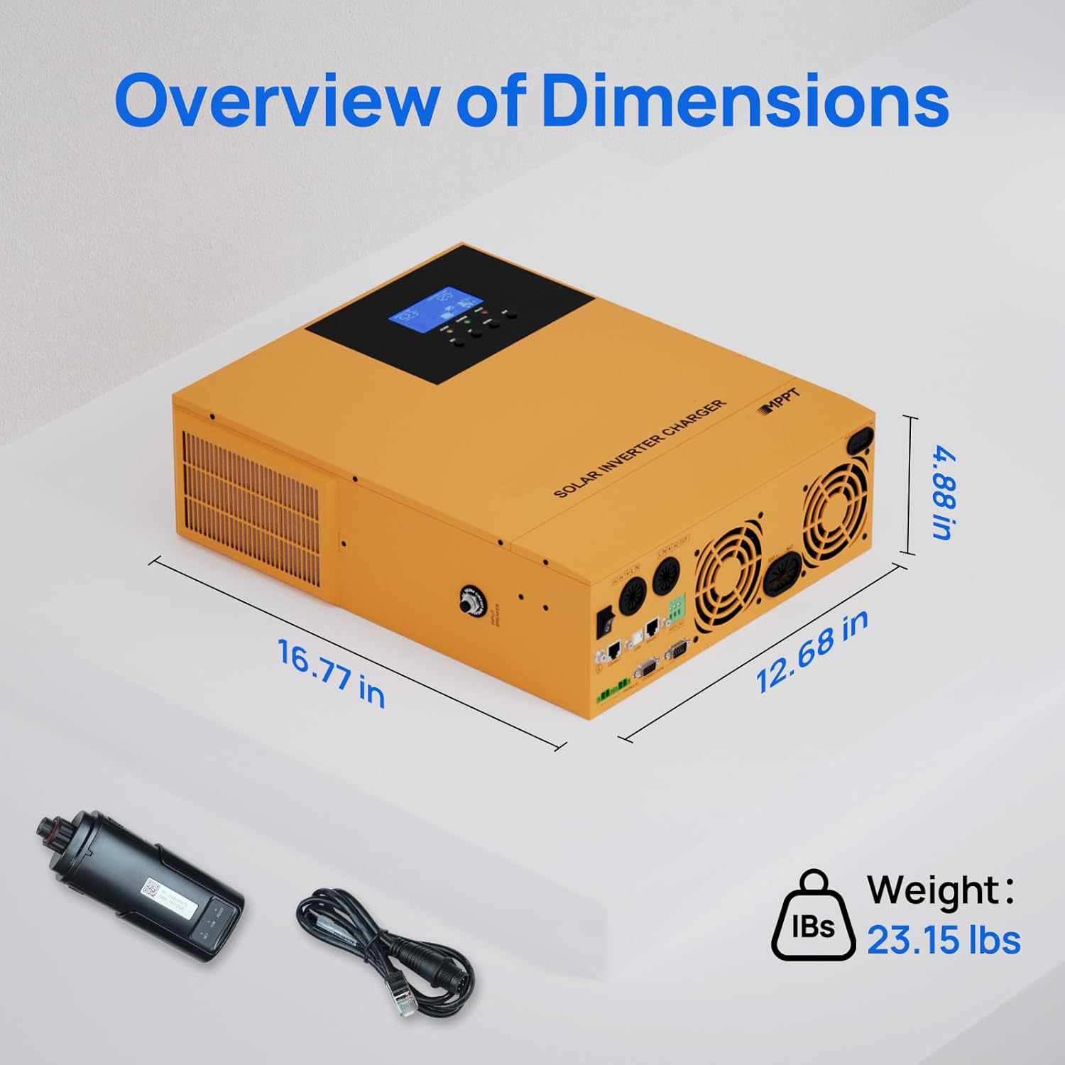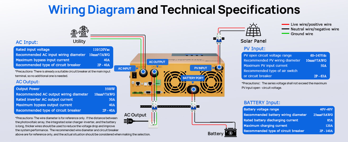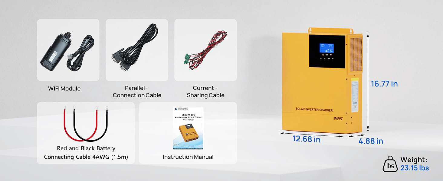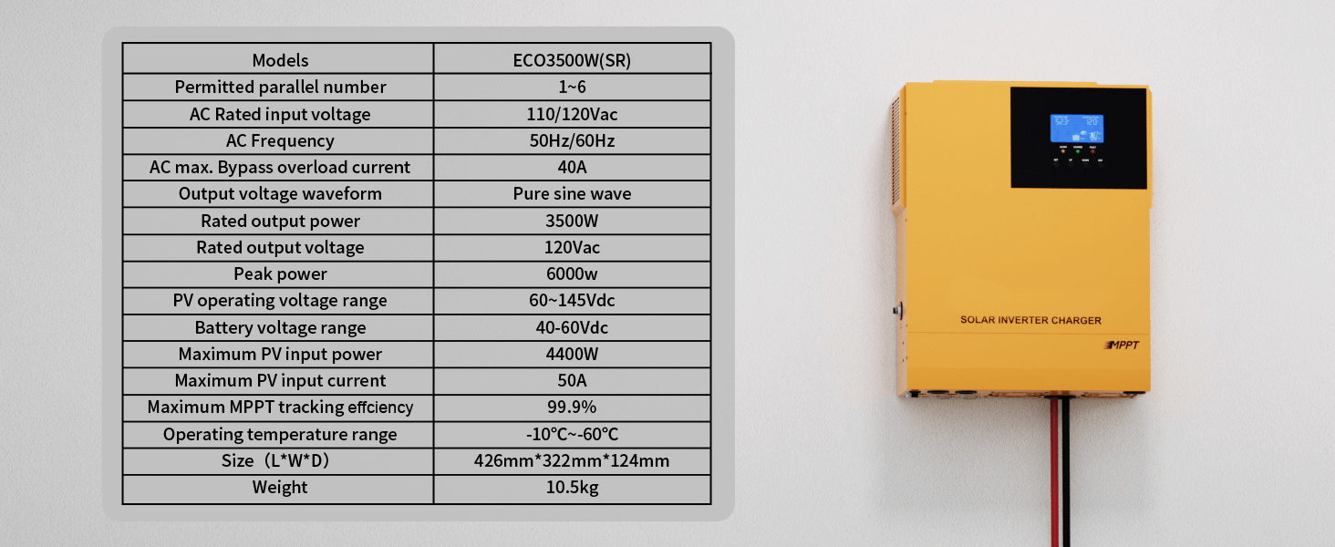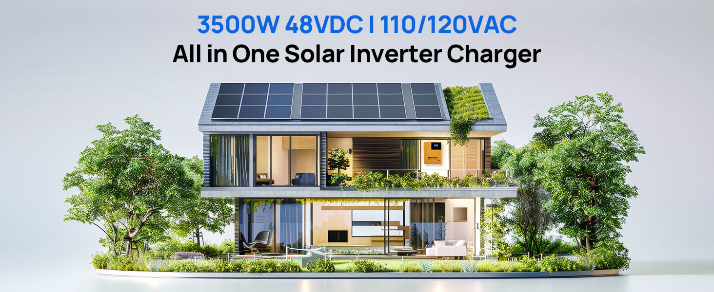 3-in-1 Solar Inverter Charger:This 3.5KW DC 48V pure sine wave solar inverter delivers max 120A battery charging (40A AC , 80A PV , 120A hybrid). Features 145V DC max open-circuit voltage,Maximum PV input power 4400W.