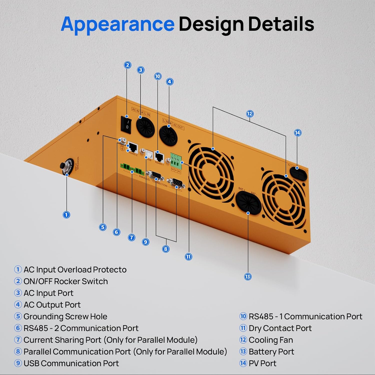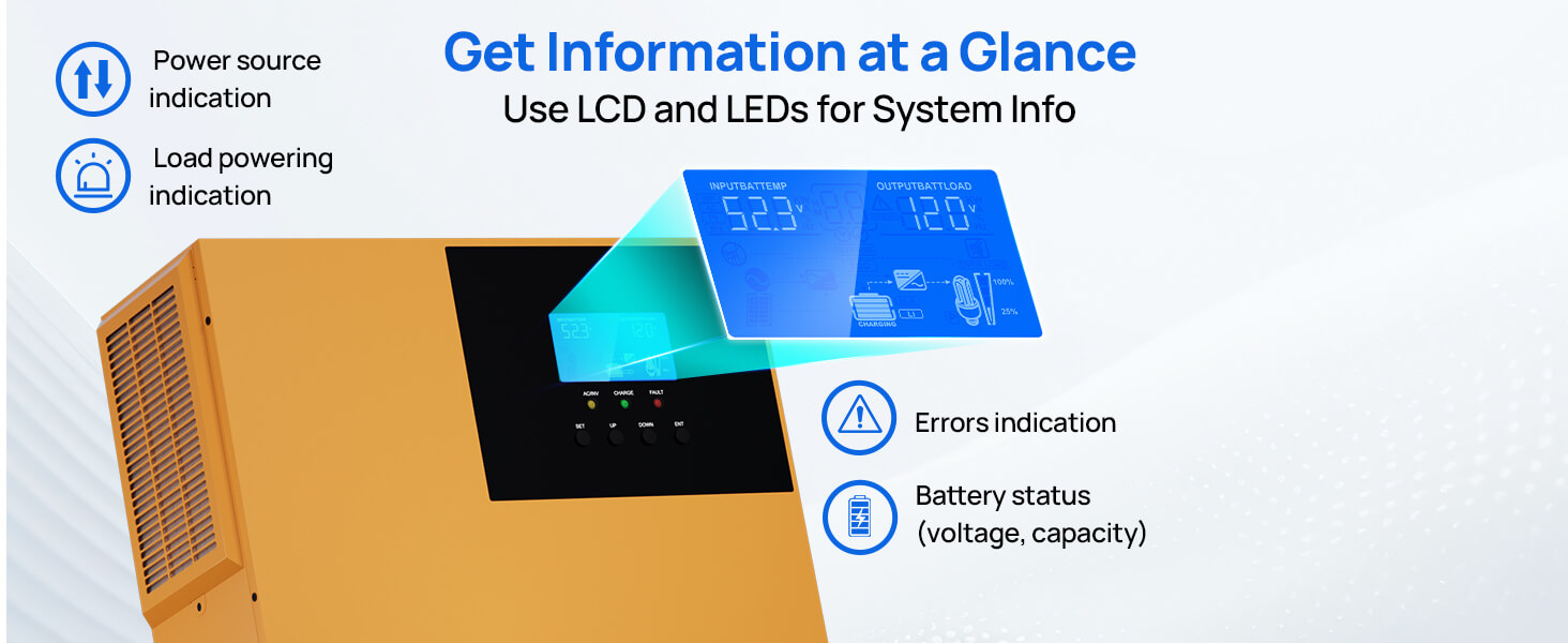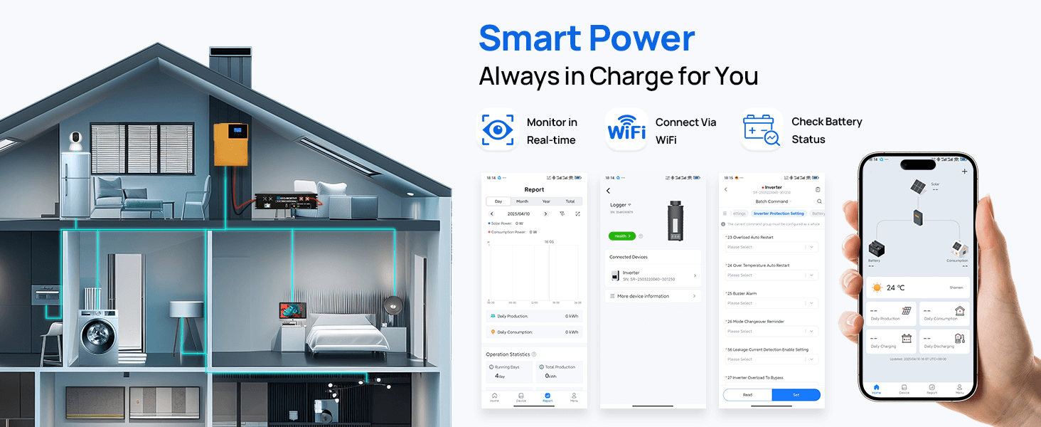 Modes on Demand, Power with Ease:① 4 charging modes: PV-priority、utility-priority、hybrid charging、only solar charging. ② 3 operating modes: PV-priority, utility-priority, and battery-priority. With 20ms switching uninterruptible power supply.