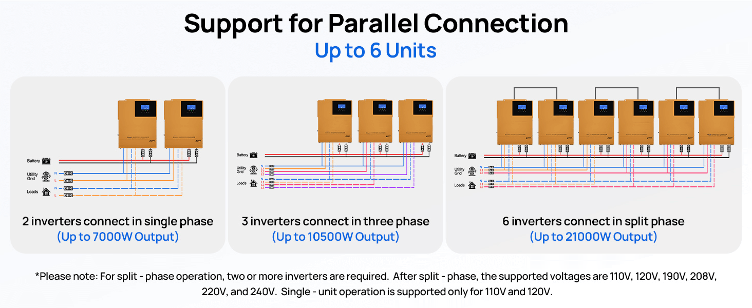 Superior Parallel-Connection Capability:Up to 6 devices can be connected in parallel, delivering a high power output of 21 KW. You can choose either single-phase or split-phase parallel connection, effortlessly meeting high-power electricity demands.