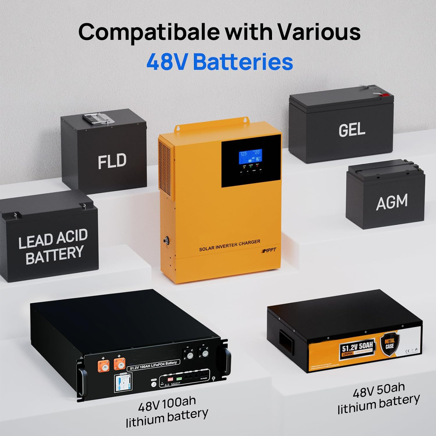 Versatile Battery Compatibility: Start lithium batteries via PV solar or mains. Our system allows the use of both lead-acid batteries and lithium batteries, offering you the flexibility to choose the power storage solution that best suits your needs.