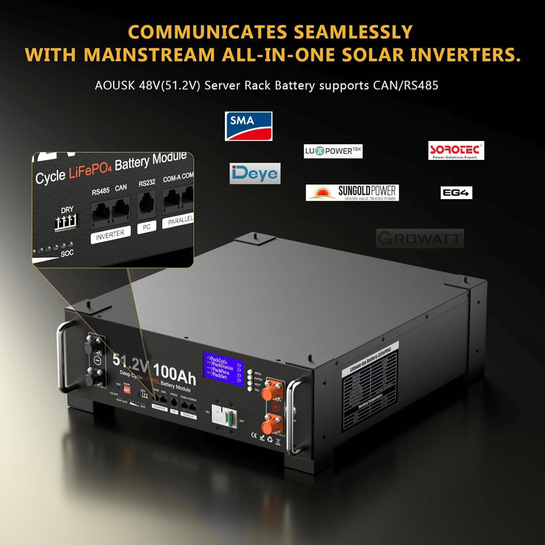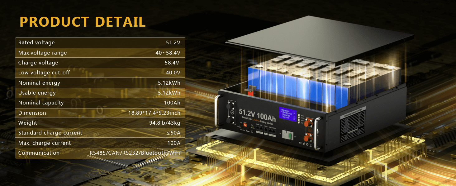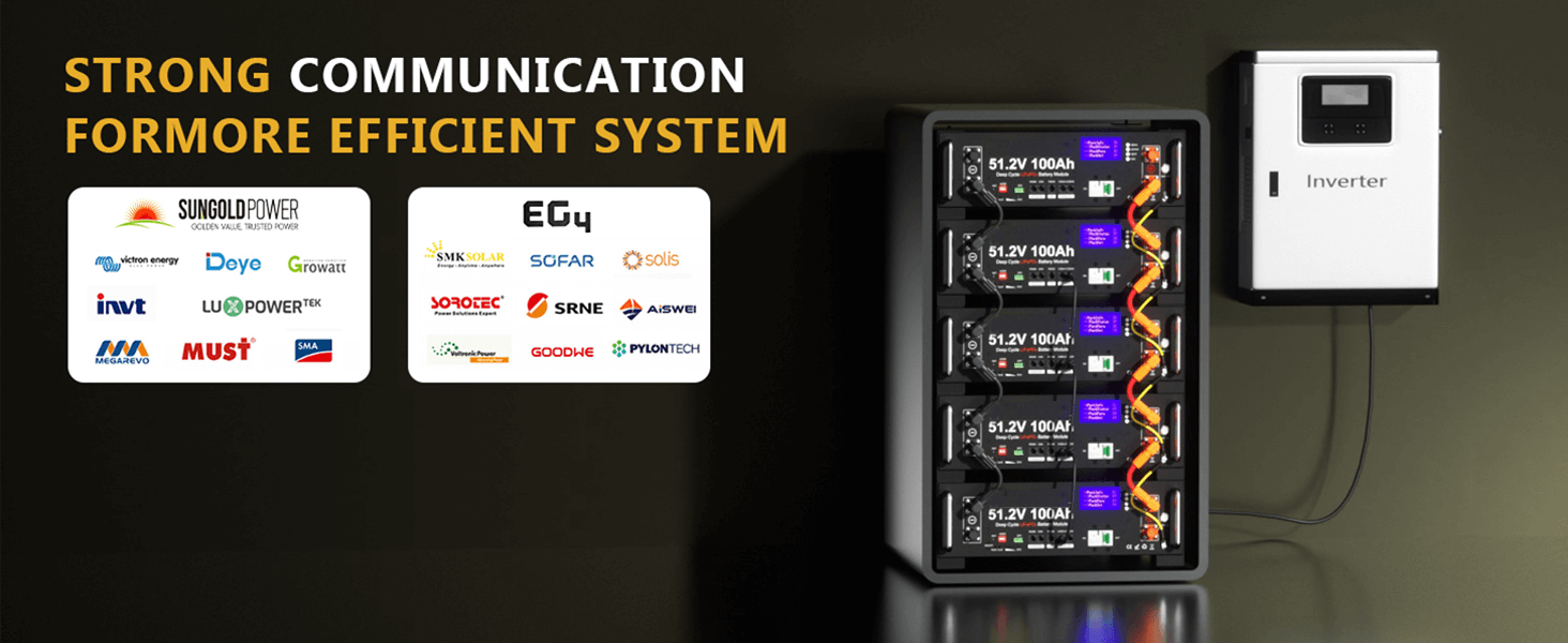 Designed for Off-Grid Solar Systems: YC 48V (51.2V) LiFePO4 solar battery supports CAN & RS485 communication, ensuring seamless compatibility with most popular all-in-one solar inverters. Monitor real-time battery status through the Bluetooth mobile app, and adjust charge/discharge parameters directly via the inverter to optimize performance and extend battery lifespan.