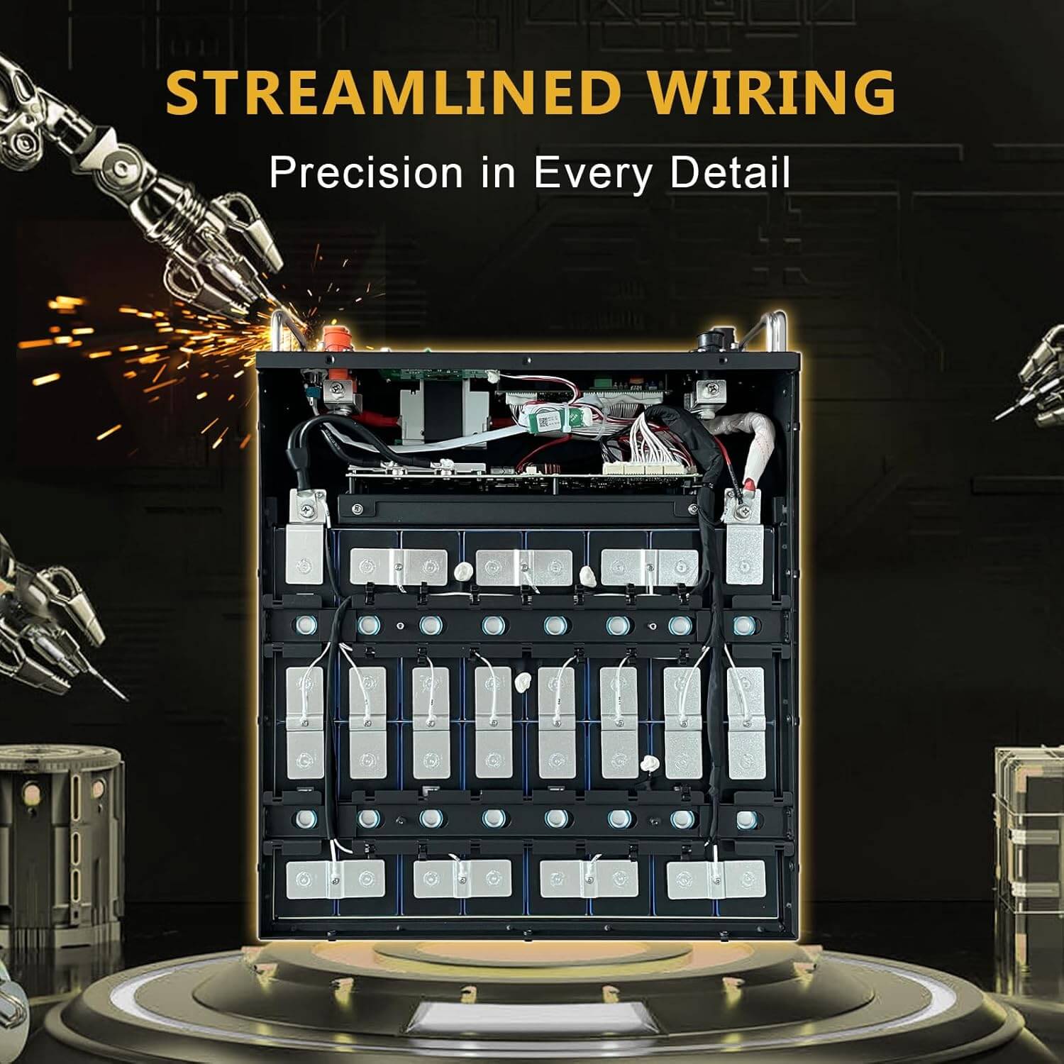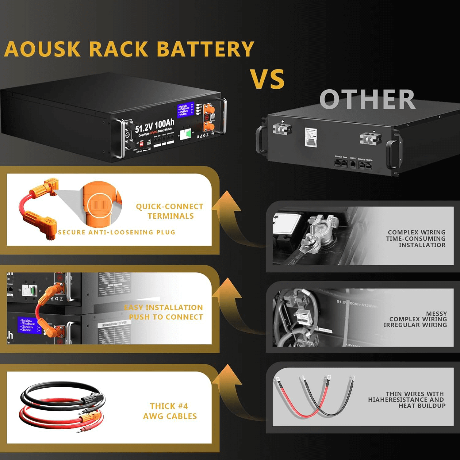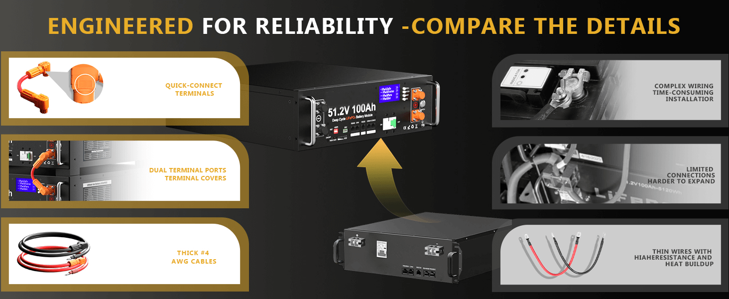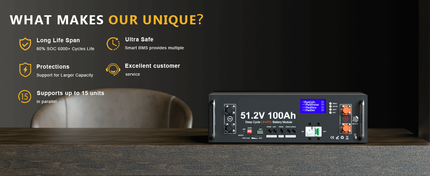 Automotive-Grade Cells & Long Cycle Life: Built with 16 premium Automotive-Grade A prismatic LiFePO4 cells, this 48V 100Ah battery delivers higher energy density, stable output, and long-term reliability. With 5.12kWh usable energy, it replaces four 12V 100Ah batteries in series (4S) while providing 6000+ deep cycles, making it ideal for long-term off-grid solar storage.