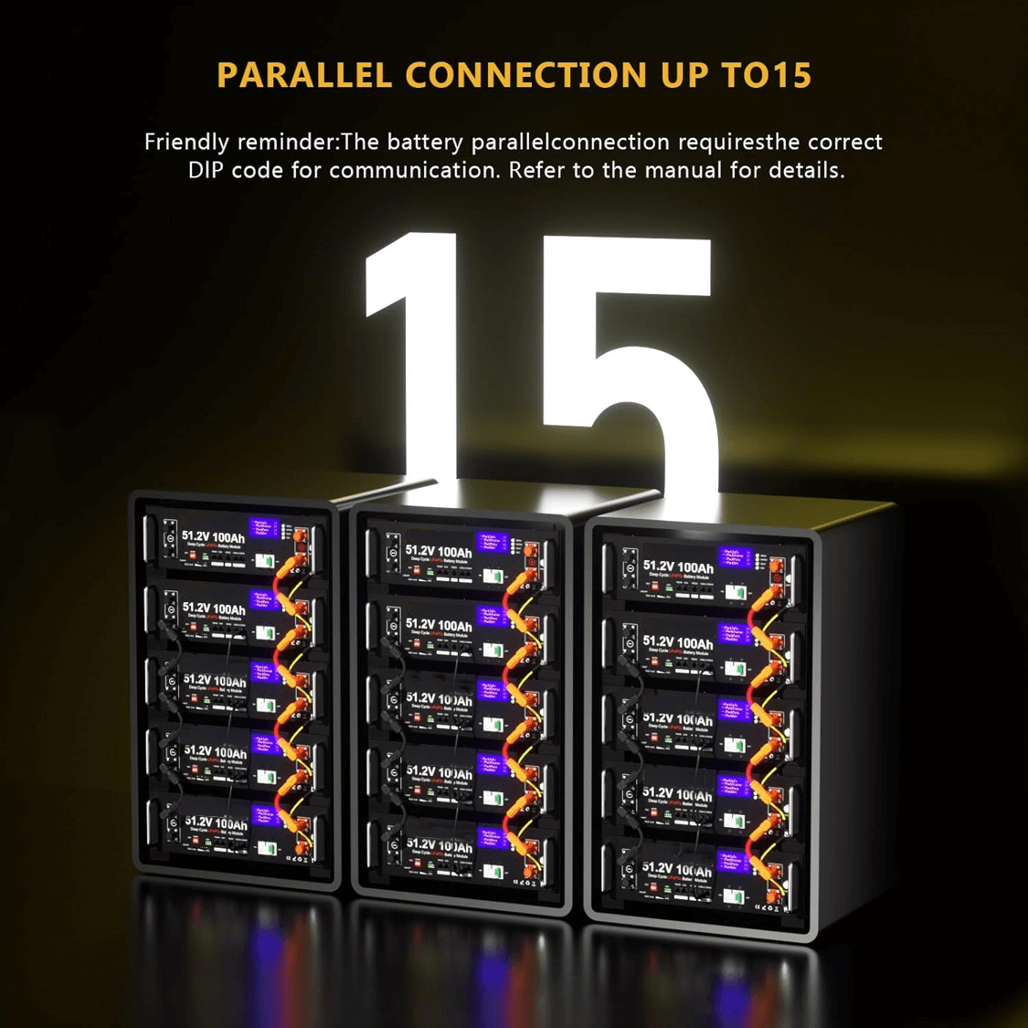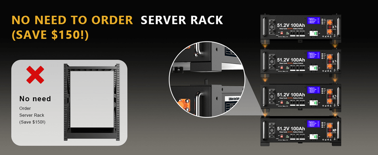 Expandable Rack-Mount Design: Designed to fit standard 3U server racks, this 48V 100Ah battery supports vertical rack-mount installation, saving space in solar power cabinets. Weighing only 94.8 lbs, it can be installed by one person. Supports up to 15 batteries in parallel, allowing you to easily expand your solar battery bank as your energy needs grow.